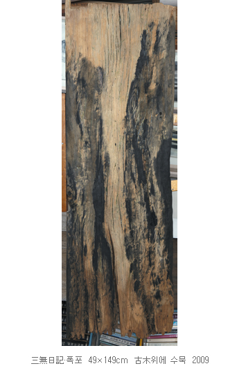 Kang Boo-eon's painting is drawn on cotton cloth, Hanji and, occasionally the board of an old tree. The reason why his canvas looks much like an rectangular ocher yard is because he actually uses not only the hair pencils but also the rough tools made of the branches of such trees as bush clover. In addition, his brushing is not limited to description of objects but extended to expression of the acts meeting the canvas and their spirits. Like the monk sweeping the frost off the yard, he cultivates his mind on the canvas for his spiritual purification. The artist focuses on contents and spirit of the objects rather than their forms, while aiming towards a reflective attitude.