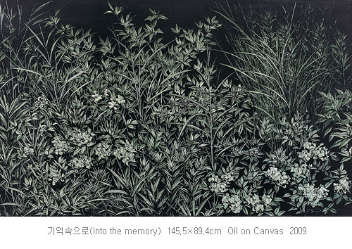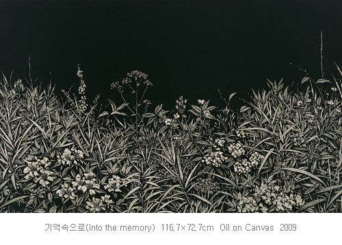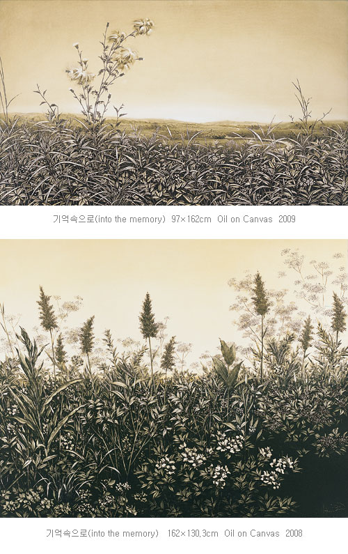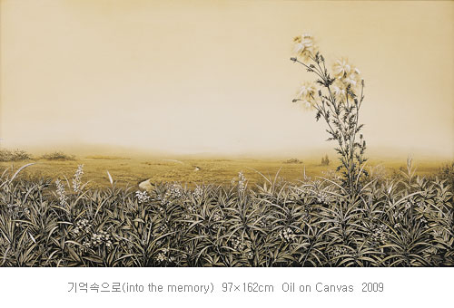 야생화가 흐드러진 들판은 고요하다. 어떤 미동도 발견되지 않는 절대정적의 공간에 흔들리는 엉겅퀴가 그나마 손짓하듯 몸을 일으키고 있다. 우뚝한 엉겅퀴는 마치 의식이 있는 영물인 듯 부드럽게 흔들리며 공간의 정적에 작은 떨림을 만든다. 그것은 극히 미미하고 섬세하지만 정적의 깊이가 한없는 것이기에 오히려 더욱 큰 파장으로 다가온다. 비록 야생화를 소재로 하고 있지만, 굳이 그 이름을 묻고 확인할 필요는 없을 것이다. 애초 작가의 관심이 야생화의 생태적 아름다움에 있는 것이 아니라 그것으로 대변되는 사유에 있기 때문이다. 작가는 엉겅퀴의 흔들림을 통해 보는 이의 시선을 화면 깊숙한 곳으로 이끌고 있다. 그것은 무성한 야생초들이 우거진 너머에 자리하는 광활한 공간이다. 야생화와 동일한 계열의 색상을 지닌 대지는 너무도 아스라하여 그 끝을 헤아리기 어렵다. 하늘과 맞닿은 곳까지 펼쳐지는 아득한 공간은 마치 자연의 원형처럼 그렇게 아득한 깊이를 지니고 있다. 인간의 욕망이나 의지는 그 절대공간 속에서 탈색되어 무기력해질 수 밖에 없다. 그것은 물리적인 크기와 넓이로 다가오는 공간이 아니라, 피안의 이상처럼 존재하는 다다를 수 없는 것의 상징일 것이다.