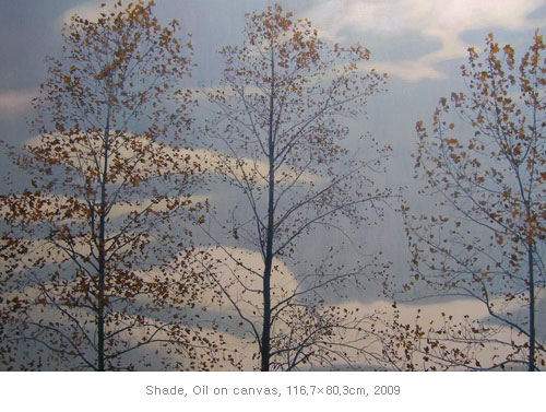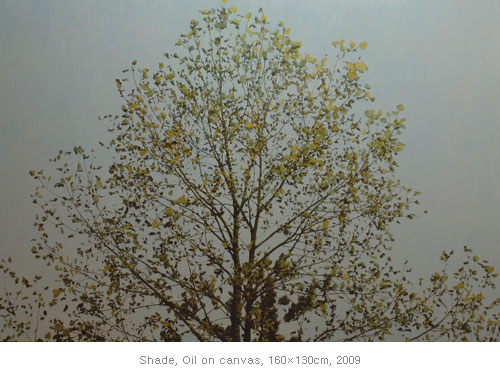 숲이 아니라 담너머 흔히 보이는 나무들이 이루는 풍경이다. 그런 나무들이 어느 순간 빛에 가려져 짚은 그늘을 만들고 목덜미를 스치는 차가움을 던져준다. 여느 일상인데도 어느 순간 다가갈 수 없는 완강한 거리를 만들어낸다. 그늘이라는 그의 작품은 상투적인 우리의 시선을 조금은 저어한다. 내가 바라보는 것이 아니라 그늘이 나를 바라보고 있다는 지각 때문이다.