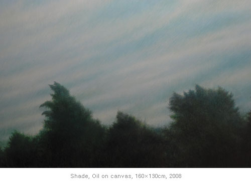 그동안의 그의 작업은 풍경이 우리를 바라보고 있었다면 이번 전시의 작업들은 시선을 투과시키거나 산란하게 하고 그리고 막힌 시선을 제시한다. 화면의 시선이 바뀌는 것은 자신을 지켜보는 변화이다. 익숙한 풍경에 한발 다가선 태도이다. 하지만 그의 작품을 견인하는 시선의 단계들은 풍경을 바라보는 그의 시선에 물음을 던지게 한다. 세계를 바라보는 시선의 이동은 작가 자신의 변화이지만 우리의 시선을 점검하는 일이기도 하다. 그늘에 대한 그의 시선은 이런 요청이 없지 않다.