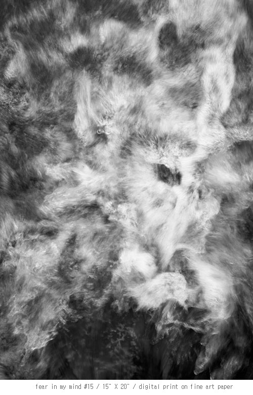 이 사진들에겐 정적인 두려움을 표현하려면 굳이 신경을 덜 써도 될 어떤 질감이, 그렇게 부여된다. 작가가(분명 그는 in my mind라 이름 붙였으므로) 내면에서 느꼈고 드러내려 했던 ‘막연한 두려움’에 공감하건 그렇지 않건, 사진을 보는 우리를 바로 건드리는 것은 질감일지도 모른다. 이를테면 사진 속에서 물은 물이되 불길처럼 일렁이고, 기름처럼 끈적거리며, 가루처럼 부서진다. 눈으로 더듬어지는 촉각이라는 감각. 어디까지나 초평면의 매체인 사진에서, 그리고 시각적인 정보가 흑과 백으로만 한정하여 찍은 ‘물들’의 사진에서(그러고 보면 물은 형태뿐만 아니라 색깔 역시 일정치 않다) 느껴지는 그러한 풍부한 질감과 촉각을 통해 때로는 이상하고 한편으로 불안하며 결국은 어떤 무섬증을 불러내곤 하는 것이다. 전체적인 작업 기준에 대한 작가의 강조, 즉 “자칫하면 평면적이기 쉽기에 그라데이션의 조절에 신경을 썼다”는 말이 단지 기술적인 고려로만 들리지 않은 것도 그 때문이다.