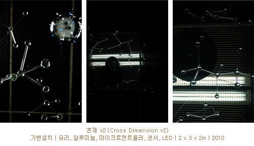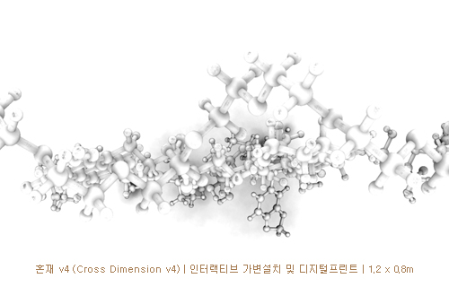 본 전시는 미디어 아트 작가 김현주의 최근 작업 혼재(混在) 시리즈 를 중심으로 한다. 이는 나노스케일의 분자나 원자 구조가 밀고 당기는 역학과 상호작용성을 인간과 사회라는 매크로한 세계에 투영시키고 관조하고자 하는 인터랙티브 미디어 작업이다. 나노 스케일의 분자모형을 미적개념으로 삼아 만들어낸 조각과 인터랙티브 설치물은 관객에게 나노스케일과 매크로스케일의 교차경험, 즉 어쩌면 우리가 익숙하지 않는 세계들 – 나노, 분자, 원자, 반데르발스 힘 등등-에서 부터 우리의 모습을 발견하거나 관조하는 새로운 경험을 제공할 것으로 본다. 혼재(混在) 시리즈는 유리와 LED, 마이크로콘트롤러를 이용한 조각 설치 작품인 [혼재 v2]와 가상의 몰입환경 속에서 나노분자구조와 관객의 상호작용을 시뮬레이션 하는 작업인 [혼재 v3] [혼재 v4]등으로 구성되고, 전시공간은 이렇게 스케일이 다른 차원의 복수의 공간과 그 공간 내의 주체가 혼재하는 “Cross Dimension”의 공간으로 새롭게 태어난다. 본 전시는 교육과학부 산하 기관인 과학창의재단의 융합창작- 과학시각화부문 지원사업의 일환으로 진행된다.