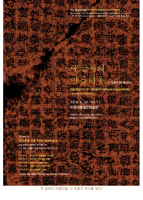 이천시립월전미술관은 2010년 9월 10일부터 10월 17일까지 약 32일간 <옛 글씨의 아름다움-그 속에서 역사를 보다- The Beauty of Ancient Korean Calligraphy-Inside it is history->전을 개최합니다. 이 전시는 선사시대부터 삼국시대까지의 유물을 통해 고대 글씨의 아름다움을 느낌과 동시에 역사와 문화도 배울 수 있는 전시입니다.