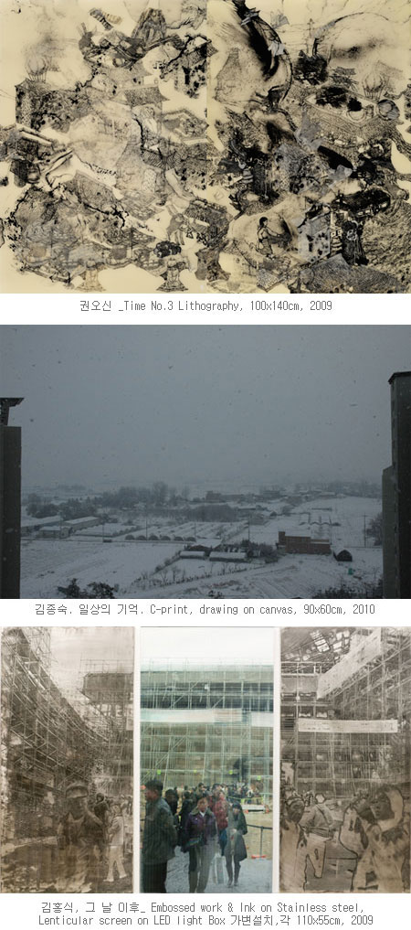 권오신은 기억의 이미지를 통해 시간을 재구성하고 그 불가사의한 신비성을 이야기한다. 특정한 시간의 장소를 여러 시점의 재 구축, 기억의 동시성 등을 몽환적인 느낌의 섬세하고 세밀한 석판화로 보여준다. 김종숙은 작가의 심상으로 본 색채로 표현되고 이어지는 자연의 변화와 빛깔을 표현한다. 일종의 풍경작업으로 송기재와 공동으로 사진을 찍고 기록하고 드로잉하며 자신의 동네의 변화를 담담하게 읽어낸다. 김홍식의 작업은 현대-도시인의 모습에 대한 관찰 일지이다. 디지털 사진으로 찍거나 차용하여 도시의 이미지를 캡처 한 후, 그 이미지를 스테인리스스틸 판에 부식시키는 등 사진과 판화 등의 기법으로써 도시의 생리를 그려낸다.