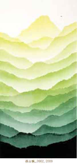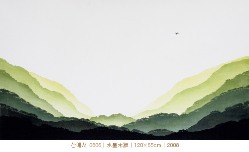 산과 섬은 텅 빈 하늘에 낮게 내려앉은 자태이다. 그 풍경에는 적막함이 감돌고, 허정虛靜한 공간과 단순한 조형미가 돋보인다. 화면은 고요하고 넓어 요활寥豁하다. 간혹 풍경속에 등장하는 큰새나 새떼조차 소리없이 움직이는 듯하다. 묵음?音의 선미禪味가 물씬하다. 옛 문인화의 사의적寫意的 수묵산수화풍을 연상시킨다. 농담변화의 능선이 겹겹한 산세는 전통적 문인화의 ‘임리淋?’하다는 분위기와 딱 맞아 떨어진다.