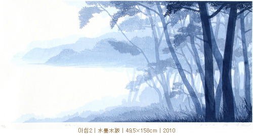 맑고 서늘하다. 목판에 새겨 먹으로 찍은, 종이에 스민 물맛이 담아淡雅하게 다가온다. 최근 김준권이 다색판으로 인화印畵한 수성水性 목판화의 첫인상이다. 수묵 농담변화의 담백함이 소쇄瀟灑한 풍경들과 어울려, 차라리 한 폭의 수묵산수화를 우려낸 듯하다. ‘산’과 ‘섬’에 관련된 연작으로 수묵水墨이나 채묵彩墨의 수성 목판화가 각별히 그런 느낌이다.