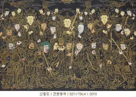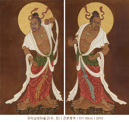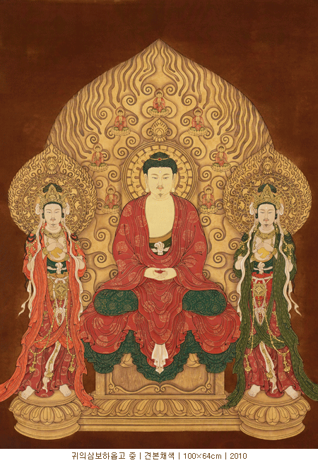 작가는 이러한 고려불화의 비단과 석채와 같은 재료에서 오는 깊고 아득하고 선명한 색의 세계와, 인간의 호흡을 닮은 길고 섬세한 선, 원문(圓紋)과 같은 갖가지 정교한 금으로 호화롭게 치장한 문양에서 깊은 감동을 받고 있는 것이다. 정신적으로 완성된 이상계(理想界)를 보여주는 고려불화의 ‘절대의 미(美)’ 앞에서 우리는 무아경(無我境)을 경험하게 된다. 이러한 고려불화의 재현은 그림을 그린 화가의 경지를 경험하고, 가장 높은 조형의 완성과 그 과정에서 오는 절대의 몰입과 성취도를 체험하는 것인지도 모른다. 이렇듯 고려불화의 조형적 특성과 아름다움(재료, 발색, 문양, 금)이 작가의 화작에 뿌리 깊게 침투해 있으며 현대에 새롭게 해석된 불교회화의 탄생에 기초가 되고 있는 것이다.