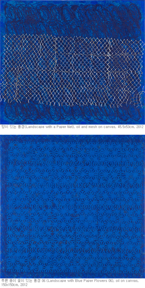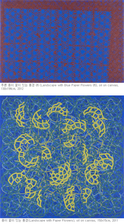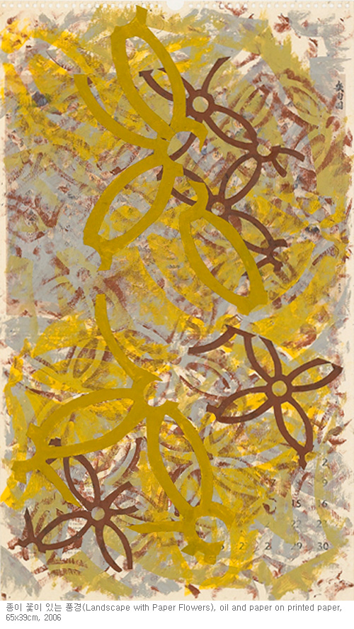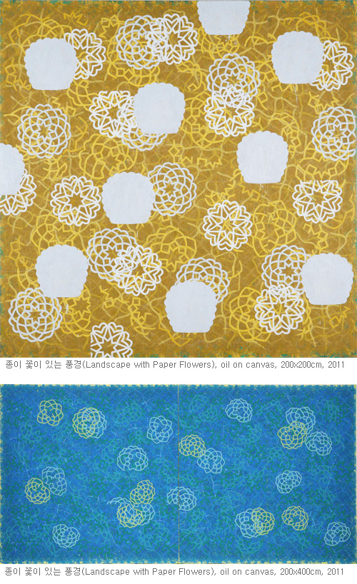 이번 전시에 소개되는 <종이꽃이 있는 풍경> 시리즈는 시촉각적 바탕위에 일상적 오브제를 대체하여 종이꽃을 배치한 2004년 이후의 작업들 중에서 선정되었다. 화면의 바탕은 원형 또는 타원형의 도구를 도장처럼 이용해 유채물감을 반복해 찍어내면서 색조와 물성이 한층 강조되고 있으며, 판화적 프로세스가 일으키는 표현의 간접성은 내밀한 리듬감을 제공한다. 그리고 표면에 펼쳐놓은 종이꽃의 강렬한 기하학적 이미지는 장식 효과와 더불어 보는이들에게 경쾌한 시각적 감흥을 선사하고 있다. 작가는 종이꽃 이미지를 채택하게 된 경위를 다음과 같이 적고 있다. “종이의 평면성과 꽃이 가지는 장식성이 흥미를 끌었고, 종이꽃은 사실성과 추상성을 동시에 만족시킨다.” 종이꽃이라는 새로운 오브제의 도입으로 이나경의 그림은 장식성과 시촉각성, 그리고 입체와 평면 사이의 조형적 일루전이 함께 숨쉬는 다중적이고 복합적인 공간을 조형할 수 있게 되었다.