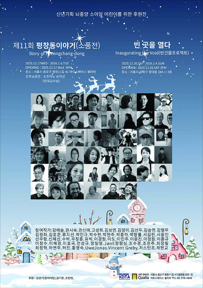 서울 중심부에서 멀지 않은 평창동의 한적한 산책로에 자리 잡은 퀄리아 갤러리에서 매년 연말 열리는 <평창동 이야기> 전은 올해에는 아직 비어 있는 동쪽의 새로운 공간과 연결된다. <평창동 이야기+빈 곳을 열다>전은 살아있는 갤러리의 생동감과 비어 있는 건물의 순수한 잠재력이라는 두 공간을 잇는 독특한 예술적 여정을 보여줄 것이다. 서울을 비롯한 여러 지역에서 활동하는 40여 명의 작가들이 회화, 조각, 사진, 설치 미술을 통해 감각적 경험의 밀도 높은 네트워크를 구축하며 이와 동시에, 20명의 작가들은 아직 비어 있는 또 다른 건축 공간에 처음으로 개입하며 그 불확실함을 시적인 시선으로 바꾸어 놓는다.