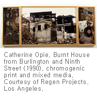In her photography Catherine Opie represents various types of communities: the people, places, and issues that bind us together. As such, her landscapes of mini-malls, freeways, and residential neighborhoods are similar to her portraits of friends, family, athletes, and club members. Opie presents her subjects with a formal clarity that often references art history from 20th-street photography to 16th-century portraiture. Burnt House from Burlington and Ninth Street takes the form of a triptych, with a large central photograph depicting a house near MacArthur Park in Los Angeles that has been destroyed by fire, flanked on either side by panels containing objects, possessions of the former tenants retrieved from the house. The unique piece with its inclusion of objects encompasses and anticipates the key themes and subjects that would emerge in Opie's work, including her numerous series exploring family and domestic space. As in so many of the artist's photographs of architectural settings, the home establishes the domestic environment as a microcosm of the larger world, a porous boundary between public and private, the self and society.