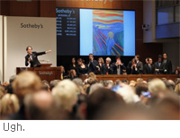 Last night, after being touted in the lamestream media as potentially the "most expensive painting ever," Edward Munch's 1895 pastel The Scream came up on the auction block. The whole event amounted to about ten minutes of back-and-forth banter, during which the theatrical Sotheby's auctioneer Tobias Meyer tempted the fates by cooing, "I've got all the time in the world." (I had such a vision of Wotan sweeping him up and whisking him off to the underworld right there!) With dapper white men and tall, thin white women making little finger signals while holding phones, speaking to strangers in Dubai or Russia or Beijing or Mitt Romney's garage, the painting was sold "to an unknown telephone bidder" for $119.5 million. Thus, a great work of art that had been all but lost to us, hanging in a private Norwegian home for more than a century, made a brief public appearance and then was sold off to another private owner, probably to disappear for another 100 years. We will likely never see this work of art again in our lifetimes. The Scream is a part of art history and should hang in a public collection, probably in Norway, and not just decorate a California den or a dacha in the Ukraine, waiting to be fodder for the next auction. (Needless to say, no museum was in a position to spend that kind of money.)