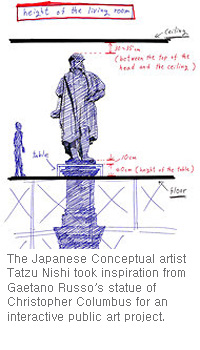 So for about four days in January 2010 Mr. Nishi visited New York for the first time and walked around, studying all the monuments he could find. What caught his eye was not what anyone expected. It was the statue of Christopher Columbus by the Italian sculptor Gaetano Russo that sits atop a column in the middle of Columbus Circle in Manhattan.