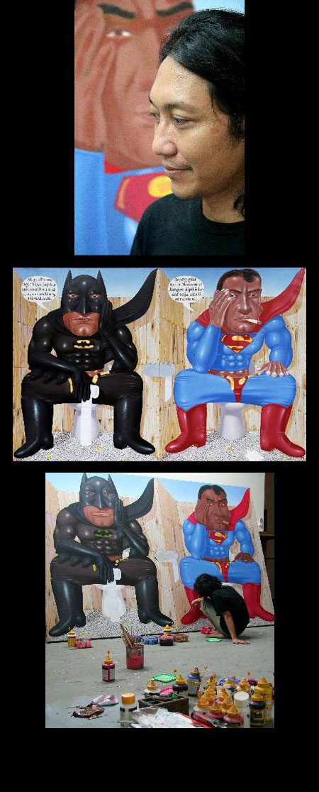 Depressed Superhero Bali-born Masriadi works in the living room of his new home, built among rice fields on the outskirts of Yogyakarta in central Java. The artist squats on the floor, working to add shine to the red pants of Superman. The 3 meter (10 foot) wide canvas depicts the superhero and Batman sitting on toilets in neighboring cubicles, both looking depressed, one smoking a cigarette.