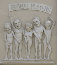The controversial sculpture belongs to a tryptich in the center of Bodman-Ludwigshafen, near its town hall. At first glance the whole relief looks like a lively panorama populated with cartoonish Germans. But one detail shows five German politicians -- including Chancellor Angela Merkel and former Chancellor Gerhard Schroder -- naked and laughing and grabbing each other's genitals. A banner over their heads reads, in English, "Global Players."