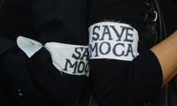 Or, perhaps, show the arm band: After the event, MOCA grant writer Elizabeth Jordan could be found outside with a gaggle of friends who were all wearing "SAVE MOCA" armbands made by Jordan, fashioned of torn white cloth and lettered with a black Sharpie marker.