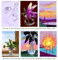 The paintings have been widely exhibited—in London (at the Tate and the Royal Academy), in Los Angeles, a broad overview in a small museum in Germany this past summer—though not yet in New York, a situation that will be rectified in late October by a major show, his first there in ten years, slated to take up both the uptown and downtown spaces at PaceWildenstein.[1] The buildup toward these shows has found Hockney busier than ever (he is still in the process of completing a dozen fresh canvases as I write), but not so busy that he hasn't managed to become fascinated by yet another new (and virtually diametrically opposite) technology, one that he is pursuing with almost as much verve and fascination: drawing on his iPhone.