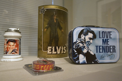 The exhibit features portraits, images from Graceland, Elvis merchandise and a reminder that Elvis' manager put his face on just about anything that could be marketed. The commercial images include an Elvis-imprinted lunch box, nutcracker, action figure and snow globe.