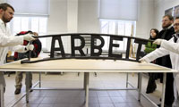 Stolen Auschwitz Sign Returns to Museum Conservation experts and museum director Piotr Cywinski, second right, examine part of the cynical "Arbeit Macht Frei" sign at the Auschwitz museum, Thursday Jan. 21, 2010. The infamous "Arbeit Macht Frei" sign stolen last month from Auschwitz and broken into three pieces was returned to the museum at the site of the Nazi death camp Thursday. AP Photo/Jarek Praszkiewicz.