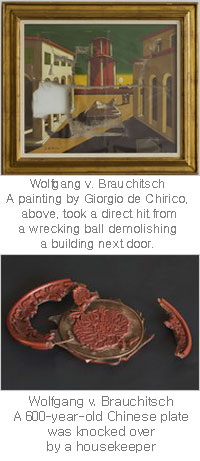 There’s more. A painting by Giorgio de Chirico, “Piazza d’Italia,” was hanging on the wall of a townhouse in the Netherlands when demolition began on a bank next door. The wrecking ball came through the wall of the house and shot a perfect hole through the canvas. In Germany, a Ming dynasty lacquer plate — about 600 years old — was hit by a housekeeper’s elbow and ended up in bits on the ground. These two items were soberly displayed by Axa Art at the 2009 Art Basel exhibition in Switzerland under the caption “The Thrill of Protecting,” although it might as well have said, “Let This be a Lesson to You.”