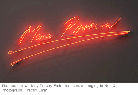 Emin is 48 but her art still carries the tag "young British". A neon by her in No 10 can only signal youth, glamour, and a dash of naughtiness. It even alludes to her great themes of love and lust in its slogan "more passion". Wow, the prime minister must really be down with the kids, we are presumably supposed to think. Is that why he is locking so many of them up?