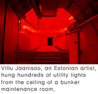 An installation piece by the Estonian artist Villu Jaanisoo, “Fog Is a Cloud That Is Related to Land,” made of hundreds of long utility lights that hang from the ceiling in one of the maintenance rooms, takes advantage not only of the physical but also of the olfactory aspects of the room, which is filled with industrial tanks reeking of fuel oil.