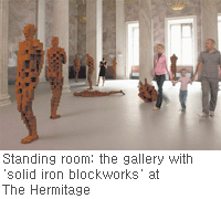 "Yes," he readily agrees with me, "and there is such pleasure to be gained from putting sculptural forms on a skyline or out in the street, and then in trying to judge how people's behaviour is modified by that sudden encounter. It opens a window onto normality." You could then argue that what Gormley is doing at the Hermitage is not so much making an exhibition as creating an argument which serves as a challenge to traditional kinds of museum-making. He sees very clearly the kind of institution that the Hermitage is, and he wants above all things else not so much to praise it and to be aligned with everything that it represents, as to storm through its doors and remake it in his own image. There is too much looming, domineering architecture here, he seems to be saying to the viewer. The works themselves simply don't stand a chance. They are little better than a sideshow. What really matters is the triumphalism of this great institution.