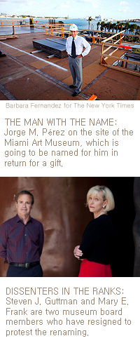 But not everyone is happy that the institution, now known as the Miami Art Museum, will be recast as the Jorge M. Pérez Art Museum of Miami-Dade County to recognize Mr. Pérez’s $35 million gift in cash and art.