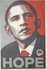 The red, cream and light-blue images show a determined-looking Obama gazing upward, with the caption "HOPE."