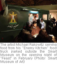 Enemy Kitchen first came to Chicago last month for the opening of “Feast: Radical Hospitality in Contemporary Art” at the Smart Museum (until 10 June). Meals were served on paper plate reproductions of china looted from Saddam Hussein's palaces; Rakowitz had previously used the real china for a project with the New York public art producers Creative Time, but the plates were returned to Iraq at the end of last year after a request from the Iraqi embassy, just as the US started pulling troops out of the country.