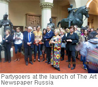 The Art Newspaper Russia launched in Moscow this week, with events in the Italian Garden at the Pushkin Museum of Fine Arts and the Italian Embassy. Nicolas Iljine, who is VP of international development at Tom Krens’s Global Culture Asset Management, was on hand at the festivities and shared a nice description of the event with us on Facebook: “Queues stood in front of the Russian publisher Inna Bazhenova & editor-in-chief Milena Orlova waiting to congratulate them and give flowers to the makers and shakers of the Russian edition, of which the 64 page pilot edition was distributed at the exit in a modest brown paper bag… An eclectic mix of artists, museum directors, journalists, gallerists and collectors—all future subscribers—were pleasantly surprised by the informal and friendly atmosphere of this very special event and even the dozens of cameras clicking did not spoil the fun.” We’re glad everyone enjoyed the party, and to our Russian colleagues: Pozdravlyayu! For a gallery of party pics, click here to see the slideshow.
