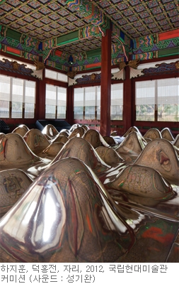 가구 디자이너 하지훈은 이토록 미적으로 아름다운 공간이 일종의 변형과 왜곡의 산물이었다는 아이러니에 주목했다. 바닥에 크롬 도장의 좌식 의자를 가득 설치하여, 실내의 벽면과 천정 장식이 의자의 표면에 다시 ‘반영’되도록 한다. 실내의 인공 조명과 외부의 자연광은 바닥 표면의 불규칙적인 반사효과를 더욱 증폭시킨다. 관객이 이 황홀한 공간을 서성이는 가운데, 사운드 아티스트 성기완의 음악이 공간을 가득 메운다. 여인의 흐느낌, 찻잔 부딪히는 소리, 약간의 웃음소리가 간간히 들려온다. 동양과 서양, 과거와 현재가 충돌하여 생성되는 강렬한 에너지가 이 ‘자리’의 특별함을 더한다.
