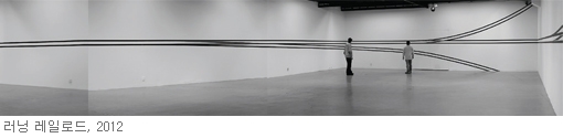 ○ 전시장 2층 벽에는 작가의 대표적 작업으로 평가되는 <Running Railroad-Running Sound Road>가 가로로 길게 설치되어 있다. 관람객은 입구에 놓인 여러 켤레의 무쇠슬리퍼를 신고 레일 패턴의 테이프 드로잉을 따라 걷게 된다. 관람객은 걸을 때마다 바람 소리 등 다양한 소음을 들으며 시지각적으로 새로운 체험을 한다. 이는 몸과 분리된 듯한 시각체험을 통해 공간감의 혼란을 일으키고, 시각경험이 몸과 밀착된 사실임을 깨닫게 하려는 의도이다.