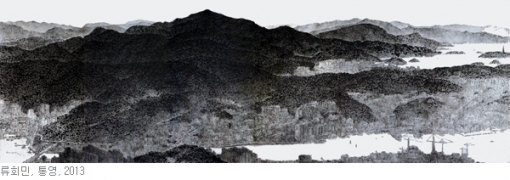 부산의 조형적 특성은, 흔히 바다의 수평선으로부터 떠올리는 수평개념이 아닌, 하늘 향해 솟은 빳빳한 수직개념이 지배적인 조형모티프로 작동하고 있음을 부정하기 어려울 것이다. 오늘도 지치지 않고 올라가는 해운대 신도시의 주상복합 고층빌딩은 이를 여실히 증명하고 있다. 이들 모두를 류회민은 묵묵히 담고 있다. <산보다 높아지는 집을 보면 슬퍼진다>(2007)라는 작품명제는 류회민이 변화하는 부산에 대해 가지는 소회를 단적으로 보여준다. 산에서 내려다보는 단단한 부산. 산을 밟으며 만나는 유연한 부산. 그는 산과 바위를 연성의 물그림이 아닌 칼칼한 먹그림으로, 제법 단단한 바위와 질감으로 올린다. 약하디약한 한지 위에 카메라의 경조(硬調)술과도 같은 강력한 흑백대비의 시각적 질감으로 떠내고 있다. 전체적으로 류회민의 넉넉한 균형감각이 빛나고 있음이다. 허심포산(虛心抱山). 그의 작업과 일상을 일컫는 적절한 말일게다.