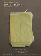 성곡미술관은 ‘2012 성곡미술관 내일의 작가’로 선정된 최찬숙의 <90억 가지 신의이름 THE NINE BILLION NAMES OF GOD>展을 개최한다. 베를린과 서울을 오가며 영상, 설치, 공연 등 실험적 활동을 펼치고 있는 최찬숙 작가는 제한된 전시공간과 시간 속에서 인간 각자의 기억 속에 내재된 에너지의 재-재현을 시도하는 작가이다. 작가는 사회적, 정치적, 종교적인 컨텍스트 속에서 사람들의 기억을 끊임없이 더듬고 발견하여, 이들의 기억과 교감하는 방법을 찾아낸다. 이러한 작업 과정들은 설치, 영상, 아트 북, 퍼포먼스 등 다양한 매체에 담겨서 공유된다.