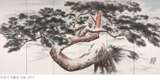 하늘 한 모서리가 날이 개이려는지 약간 푸른 기색이 돌고 있다. 더는 뺄 것도 보탤 것도 없는 완벽한 구도에 절묘한 채색이 균형과 조화를 얻고 있어 아쉬운 데가 없다. 하늘. 땅. 소나무가 하나의 기운으로 꿰뚫려 있는 신운생동(神韻生動)의 경지인 것이다. 그림 전체에서 뿜는 상서로운 기운이 너무도 순수하고 강렬한 것이어서 보면 볼수록 그 속으로 빨려 들어가고 말 것 같다. 바로 지금 이 적룡송 서설이 우주의 중심이라고 해도 과장은 아니리라.
