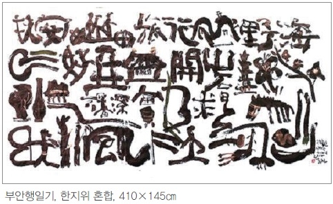 작가의 고향인 부안의 풍경을 그린 [부안을 생각하며]라는 작품을 보자. 작품 왼쪽 맨 위부터 하나하나 읽고 감상하면 된다. ‘부안(扶安)’, ‘자동차’, ‘여행(旅行)’, 산의 형상, ‘야(野)’, ‘해(海)’가 써지거나 그려져 있다. 풀이하면, “부안으로 차를 몰고 여행 가는데 산과 들과 바다가 보인다”라는 것을 표현한 것이다. 이후 호(好)자, 풍(風)자를 비롯한 다양한 글자와 형상을 통해 부안의 아름다운 풍광을 일기 쓰듯 표현하고 있다. ‘개암(開岩)’이란 글자와 옆의 탑모양은 ‘개암사’를 의미한다. 부안의 풍광을 그린 또 다른 작품에는 ‘매창(梅囱)’이란 글자가 써져 있다. 조선시대 시와 거문고에 능한 기생출신 여류시인 ‘매창’이다. 작가의 작품에 자주 보이는 글자 중 하나는 ‘풍(風)’자다. 때론 봉황이 날기도 한다. 작가의 자연과의 호흡 및 상상력을 담은 형상이다. 작품을 보다보면 한 눈에 부안의 아름다운 풍광과 그 풍광에 서린 작가의 추억을 느낄 수 있다.