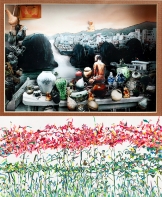 김정희 작가는 이름도 없고 주인도 없이 방치되어있던 골동품들과 사물들을 직접 사진을 찍고 콜라주하여 세상으로 끌어내고 서로 어울리게 해서 존재감을 드러내는 작업을 한다. 작가는 태어날 때부터는 존재가치를 부여받기위해 이 세상에 나왔지만 인간의 삶처럼 경쟁과 관심에 도태되어있는 존재들에 주목하고 상상력을 발휘하여 그들을 특수한 공간 안에 정적인 느낌으로 배치하되 동적인 이미지를 삽입시켜 미묘한 위기감을 나타낸다. 사물에 영혼이 있다는 작가의 믿음은 사물들의 의인화를 통해 엉뚱하고 재치 있는 주제부를 만들어냈다. 그 주제부가 드러내는 ‘무명들의 소리 없는 아우성’ 이 작품의 메시지라고 할 수 있다. 이 무명한 존재들의 영혼이 관객을 미래의 좋은 세계로 인도하고 위로해 준다는 느낌을 작품에 나타내기 위해 작가는 꼭두각시 인형이나 희귀한 식물과 같은 소재를 사용하며 인간사를 사물에 빗대어 긍정적인 은유로 비틀기도 한다.   다소 특이하고 초월적인 동시에 해학적인 사물들이 서로 뒤섞여 표현된, 일상적이면서도 익살스러운 풍경을 통해 경쟁 사회 속에서 보다 인정받기 위해 하루하루 분투하며 살아가는 현대인들이 잠시나마 위로받을 수 있기를 소망한다.