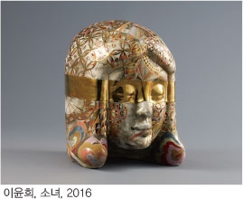 이윤희 작가는 내면적 감정, 소리에 귀 기울이고 일련의 알레고리적 풍경으로 풀어낸다. 이는 백자로 하나하나 빚어 덩어리 지워지거나, 두상에 문신처럼 새겨진다. 신작 ‘Garden of Night’은 삼층으로 나뉘어 있으며 맨 위 쪽에 세 명의 소녀가 서로 의지하거나 기댄 채 올라앉아 있다. 그 아래에는 복숭아, 꽃 모양 받침, 소녀의 두상, 자가 증식하는 이름 모를 식물의 줄기 등등이 한 데 담겨 있다. 여기 더해진 금빛 문양은 신화적 상상마저 불러일으키고, 화려함으로 장식성을 높이면서도 백자 특유의 차가움에서 오는 위태로운 긴장을 더욱 강조한다.