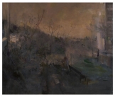 처음 작가의 작업실을 찾았을 때 보았던 밤의 시멘트 기둥들은 물감이 마르면 색과 형태들이 그 림이 시작된 검은 바탕색 속으로 빨려 들어가 사라져버리는 과정이 반복되고 캔버스 위에는 오랫 동안 쌓인 붓터치 덩어리와 함께 어두운 유화 물감의 반사층만 남아 있게 되었다. 흰 색부터 시 작했다면 어렵지 않게 그려낼 수 있던 밤의 풍경들은 그릴수록 일그러지고, 그 속에서 형상과 공 간이 사라지는 과정을 거쳐 작가는 막연한 삶의 단서로부터 다음 작업을 이어나갈 새로운 층위를 보게 된다.