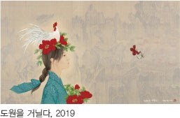 신작으로 선보이는 12지신의 도입 역시 이러한 일련의 변화 맥락에서 이해할 수 있을 것이다. 이미 전통의 한 전형으로 자리하고 있는 12지신의 도상들을 특유의 섬세하고 정치한 인물표현과 병치함으로써 전통에 대한 존중과 현대라는 가치의 수용이라는 작가의 일관된 작업의 정체성은 견지하되 새로운 시각적 이미지를 창출을 통해 현대성을 확보하고자 하는 것이다. 이러한 변화와 모색, 실험과 추구는 모두 일정한 방향성을 지니고 있다. 그것은 바로 전통과 현대라는 접점에 대한 반복적인 고민이자 실천에 다름 아닌 것이다. 물론 이는 일거에 해소될 수 있는 문제가 아님은 작가도 잘 알고 있을 것이다. 그만큼 전통의 깊이와 무게는 심중하며 현대라는 시공 역시 대단히 복잡다단한 것이기 때문이다. 변해야 한다는 명제에 충실하며 현대라는 가치를 수용하고자 노력하는 작가의 분투와 변하지 않아야 한다는 한국화의 정체성에 대한 집요한 천착에 긍정하며 작가의 향후 작업을 기대해 본다. 그것은 이미 작가가 작업을 통해 담보한 수준과 지향을 통해 볼 때 충분히 기대를 갖게 하기에 충분한 것이다.