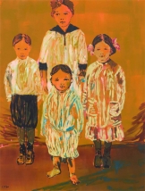 네 명의 아이들이 집 앞에 서 있는 모습을 담은 작품은 작가가 중고품 가게에서 발견한 빅토리아시대 사진을 기반으로 그린 것이다. 파운드 이미지(found image)를 회화 작업에 활용하는 방식을 주로 택해온 타부레는 “내가 이미지를 찾을 때도 있고 이미지가 나를 찾아올 때도 있다”고 말한다. 오래된 사진속 익명의 가족에게 흥미를 느낀 작가는 그들을 위한 배경을 창작하기 시작했다. 밝은 색의 추상 모양들로 꾸며진 아름다운 정원은 생기와 활기를 띠지만 미스터리한 느낌 또한 만연하다. 표현적이고 의미심장하지만, 동시에 단편적 이고 불완전하고 불가해하다. 역사적인 인물화 작품들을 찾아보던 타부레는 특히 에드바르트 뭉크의 <오스고르스트란의 네 소녀들>(1902)에게 강한 영감을 받았다. 네 명의 어린 소녀들이 장례식에 가기 위한 복장을 하고 뭉크의 집 노란 벽 앞에 서 있는 모습을 그린 수수께끼 같은 그림이다. 뭉크는 상실감으로 가득 찬 어린시절을 보낸 후 인간존재의 연약함과 극단성에 관심을 갖고 작품을 통해 내면의 삶을 강렬하게 표현했다. 자연스레 아이들은 뭉크의 작업에 자주 등장한다. 타부레에게 뭉크의 작품은 화면구성에서뿐 아니라 유년기 경험에 대한 반추, 정서적·심리적 상태의 표현, 인간의 내면과 바깥세상 사이의 관계, 그리고 개인과 집단 사이의 상호관계에 대한 고찰 등의 주제 면에서도 영향을 주었다. 타부레 작품 속 아이들은 다같이 순응적으로, 의식적으로 정면을 바라보며 어떠한 일체감을 이룬다. 그러나 그들의 개별 표정은 어색하고 조심스럽고 경계하는 등 모호하다. 작가는 이 긴장감이 고조된 장면 속으로 우리를 끌어들여 몰입하게 한다. 그 종잡을 수 없는 공간을 관람객 각자 나름대로 이해하도록 내버려둔다.