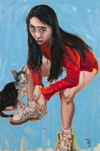 퀭한 눈은 슬픔을 담은 것일까, 세상에 대한 두려움을 드러내는 것일까. 아니면 그 눈은 무언가 호소하는 눈빛이거나 모델로서의 지루한 시간에 갇혀, 어쩔 수 없이 생각을 멈춰야 하는, 또는 다른 세계에 대해 상상하는 눈일 수도 있다. 하반신을 벗은 채 두 팔을 무릎에 올려 구부린 상체는 중력을 잃은 듯 화면 위에 부유하고 있다. 흘러내린 물감의 흔적을 제외하면 배경은 거의 텅 비어있다. 그래서일까. 검은 긴 머리에 싸인 얼굴은, 허리를 숙이고 있기 때문이기도 하지만, 화면 전체로 돌출하며 보는 나의 시선을 끈다. 유달리 큰 눈, 맑은 흰자위 속에서 빛나는 눈동자는 촉촉하게 젖어있는 듯하다. 빠르고 활달하기 때문에 거친 붓질은 이 인물을 재현이 아닌 표현의 영역으로, 더 나아가 감각이 살아있는 신체로 만들고 있다. 덜 그린 듯한, 즉 재현과 묘사를 포기한 순간 화면에서 신체는 대상이자 주체로 새로운 시간을 가진다. 그래서 내가 보는 것은 잘 재현된 인물의 외양이 아니라 작가의 감각이 살아 꿈틀거리는 붓질과 색채의 율동이자 활력이다. 그런데 그 눈을 슬픔이나 두려움으로 보려는 이유는 무엇일까. 보는 눈의 타성에 젖은 습관 탓일까, 아니면 내가 그렇게 보기를 원하기 때문일까. 그것은 그려진 대상을 나의 망막과 시신경으로 보았지만, 나의 마음이 반응한 결과이기 때문에 주관적일 수밖에 없다. 이러한 추론과 해석은 대상과의 상호작용의 결과라기보다 대상을 타자화한 것이므로 나는 그려진 대상을 평형선 위에서 관찰하는 존재가 된다.