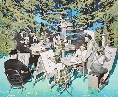 전시의 제목인유벤투스는 ‘청춘’을 의미하는 라틴어이다. 작가는 청소년들의 다양한 운동경기 장면을 우화적으로 포착하여 왼손의 미숙하고 즉흥적이며 역동적인 스트로크와화려한 색채로 활력 넘치는 화면을 보여준다. 이와는 다르게 오른손으로는, 현실에서 발생할 것 같지 않은 상황, 예로 흔치 않게 물에 차있는작가 작업실이나 공원 같은 실내 외에 자연스럽게 모여 일상을 누리는 군중들의 풍경을 자아와 초자아 그리고 무의식이라는 구조적인 3단계 구분을 한 캔버스 안에 봉합시켜 왔다. 특히 르네상스 시대발명된 유화의 글레이징(glazing)이란 클래식 기법으로 여러 겹의 레이어를 주면서 회화적 깊이와함께 정치하게 조작된 사실/비사실적인 회화를 선보여왔다.