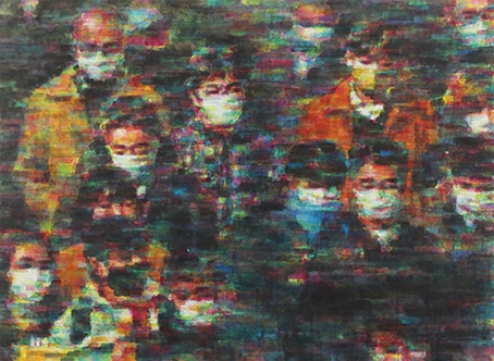 먼저 작업 과정을 살펴보자. 작가는 한지 화면 전체에 가로망처럼 일정 간격으로 ‘수묵가로획선’을 그은 후 그것을 바탕 삼아 인터넷 매체의 다양한 이미지들을 차용하거나, 직접 연출 촬영한 군중의 이미지들을 소재로 작업을 시작한다. 이어서 이미지가 배경에서 배어나오듯 분해된 원색의 짧은 가로획들을 수십 번씩 중첩시키며 화면을 구성해 나간다. 이때 이 특별한 ‘수묵가로획선’은 전자 기기 스크린의 ‘주사선’ 또는 ‘디지털 그물눈’에 비유될 수 있는데, 이러한 해석은 민재영의 회화를 이해함에 있어 설득력을 갖는다. 전통 동양화 도구와 현대적이고 전자적인 이미지 제작 방식이 서로 만나는 교차점에 민재영의 회화가 위치한다는 뜻이다. 그렇다면 이 가로 먹 선은 작품에서 어떤 역할을 하는가? 먼저 먹 선은 화면 전체를 균질하게 만든다. 다시 말해서 한 화면의 공간적 거리감이나 형상과 배경의 위계를 없애고, 필 획 하나하나를 서로 이어주고 잡아주는, 이미지 구축을 위한 화면의 기본 망 같은 역할을 하는 것이다. 그리고 더 나아가 가로망과 중첩된 원색의 획 입자들의 모음으로 이뤄진 민재영의 ‘풍경화’는 오늘날 미디어가 생산해내는 사물화된 이미지인 시뮬라크르로 확대 해석이 가능하다. 각종 매스미디어의 이미지처럼 원본의 의미를 상실하고 그 자체로서 실체성을 획득한다고 볼 수 있다는 것이다. 주사선이나 전자기기의 픽셀과 동격으로 이해할 수 있는 ‘수묵가로획’의 망으로부터 스며 나온 이미지들은 우리시대의 이미지처럼 현실과 밀접하게 맞닿아있고, 현실의 일부이기 때문이다. 그러므로 민재영의 이미지는 전통 회화의 재현된 이미지가 아닌 그 자체로 실체성을 획득하는 시뮬라크르와 닮아있다.