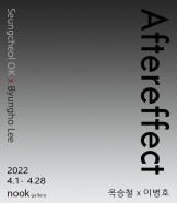 누크갤러리는 2022년 4월 1일부터 4월 28일까지 옥승철, 이병호 2인전 < 애프터이펙트 Aftereffect >를 개최한다. 이번 전시 <Aftereffect>에서 두 작가는 서로의 작업적 관점과 방법론을 적극 교환하거나 교감한다. 단, 공동작업이 아니라 조각, 회화라는 각자의 독립된 형식을 유지하면서 상대의 특징적인 작업 요소를 부분 적용하거나, 공유하고 있는 유사성을 강조해 부각하는 방식이다. 사후 보정 또는 효과, 자국 등으로 의미 지을 수 있는 ‘aftereffect’는 원본의 수정과 재 복제를 거듭하면서 자기 증식해 나가는 상징적 과정을 지칭한다.