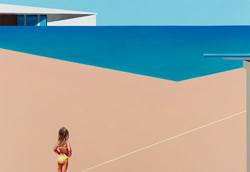 이번 전시작 중 수영장 시리즈는 비제한적인 면의 사선 분할, 색 대비의 강렬함, 뒷모습의 또는 무표정한 등장 인물을 특징으로 하고 있다. 작품 속 인물들은 복잡하고 빠르게 변해가는 치열한 경쟁 사회 속 현대인의 고독한 모습을 나타내며, 인공물인 수영장의 반복된 등장은 자연에 대한 동경을 표현한다. 등장 인물들은 휴식을 취하는 것처럼 보이지만, 낯설고 새로운 세상에 대한 불안감과 기대감을 동시에 품고 있어, 관객에게 다양한 감정을 고스란히 전달한다.
