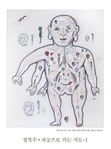 한편, 그 치열한 자궁으로의 회귀 욕망과 기억과 기록을 더듬는 정복수의 진술은 남은 삶에의 욕망이자, 더불어서 죽음의 길을 순연하게 찾기 위해 작성하는 지도다. 정복수에게 그림은 그 지도를 제작하는 것으로 부터 그 지도에 표기하는 메모와 주의사항들을 꼼꼼하게 형상으로 확인하는 절차이기도 하고. 자궁에서 나 왔을 때부터 그의 의식에 지문처럼 새겨진 죽음에 대한 메멘토 모리를 통해 끊임없이 의심-저항-확인-수 용해온 지난 50년의 작업적 변증이, 정복수에게는 자궁으로 돌아가고픈 그의 본능과 의지의 생산 과정이었 다고 하겠다. 기실, 그게 화가의 일이다. 그가 출발해서 떠나왔던 자궁 입구를 찾기 위해 그리는 삶과, 마침 내 그곳에 다다랐을 때 비로소 그리기를 멈추는 것 말이다. 그 궤적을 그림으로 기록하고 표현하는 게 바로 작가적 삶과 죽음의 표지일지니, 여적 그리고픈 인간이 많다는 정복수에게 「자궁으로 가는 지도」는 또 새 로운 인간 유형을 탐색하는 길을 열어 줄 것이다. 67년을 걸어온 만큼 회귀하는 길 또한 만만치 않게 길 터 이니, 그가 그릴 인간들은 아직 많이 남았을 것이다. 다만, 이제는, 격렬한 본능보다는 존재를 사유하고 탐 색하는 깊은 인간형이 더 많아지지 않을까 유추해본다.