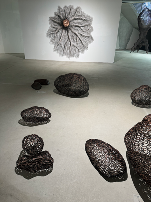이번 전시에서 최초로 시도하는 소나무 뿌리와 돌을 형상화한 대규모 설치 조각과 드로잉은 재료적 특성의 대조와 변형, 형태와 질감, 곡선과 직선, 색상 대비, 지속 가능성을 등을 실험하고 탐구한 결과물이다. 동파이프로 만든 소나무와 돌덩어리는 대상의 표면(피부)이면서 동시에 골격(입체)으로 존재하는 것이다. 부분이 모여 전체적인 형상을 빗어내는 특유의 기법을 활용해 동 파이프 절편 하나하나가 자연형상을 일궈내는 생명의 최소 단위원소, 생명의 씨앗, 소우주, 세포와 의미론적으로 동일시되고 있다는 것을 보여준다. 소나무 뿌리는 땅속으로 깊이 파고들어 삶의 원천이자, 자연의 성장과 생명력을 상징한다. 반면 돌은 고요한 불변의 존재로, 시간에 저항하는 강인한 특성을 상징한다. 이 두 대립적인 속성 간의 관계는 생명과 불변, 변화와 안정, 유기적과 무기적 사이에서의 균형을 나타낸다. 이 두 가지 상반된 요소를 결합한 60점의 작품들은 생태학적 이해, 지구의 생명력과 다양한 형태의 생명체와 함께하는 환경 의식과 행동의 변화를 촉진하여 예술 활동의 의미를 사회 전반으로 확산시키는데 기여한다.