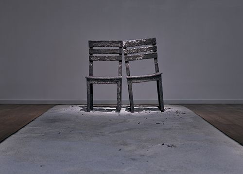<삶의 다섯 가지 질문>은 크게 2개의 질문으로 나누어 볼 수 있습니다. 하나는 ‘어머니의 기억’에서 비롯되었습니다. 3층 전시실에는 얼마 전에 유명을 달리한 어머니를 기억하는 작품 3점을 선보입니다. 소복이 쌓인 재 위에 숯처럼 새카맣게 탄 의자가 두 개가 나란히 놓여 있습니다. 더 이상 앉을 수 없는 의자입니다. 그런데 의자 하나가 다른 의자에 기대어 있습니다. 이 의자도 머지않아 바닥에 뿌려진 재가 될 것입니다. 벽에는 특이한 작품이 걸려있습니다. 천에 심박 그래프처럼 보이는 선을 보라색 실로 한땀 한땀 수놓은 <보라>라는 제목의 작품입니다. 천은 염할 때 쓰는 천인듯합니다. 더불어 작은 모니터에 생전 어머니 모습이 재생되고 있습니다.