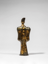 전시장 1층에는 자연과 인간에 대한 깊은 애정이 담긴 인물 형상의 금속 예술 작품을 시작으로, 주전자, 잔, 쟁반, 거울 등 다양한 기능과 용도의 작품이 전시 공간을 채운다. 〈돌아가는 당신과 나〉(2022)에 사용된 녹청 기법은 작가가 미국에서 익힌 서양의 금속공예 기법으로, 작가는 이 기법을 1980년대 홍익대학교에서 풀브라이트 초청교환교수로 금속공예를 가르치던 때부터 한국의 금속공예계에 널리 알리기 시작했다. 도교에서 ‘선’과 ‘자비’를 상징하는 불사조(봉황)가 올라간 작품 〈불사조〉(2012/2024)에서는 은 표면 위의 금부 기법이 돋보이며, 〈대부〉(2022)와 짝을 이루는 〈대모〉(2012/2023)에서는 은과 금부, 옻칠의 정교한 조화를 통해 작가가 다양한 금속공예 기법에 대해 연구하고 고민한 흔적을 엿볼 수 있다.